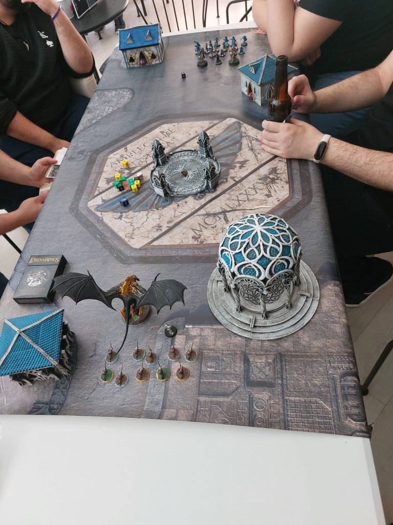 Empiezan las partidas de la mañana, con los clanes celtas de Inis en pugna por el trono de Irlanda, mientras en la mesa de D&D un grupo de aventureros se reúne para desentrañar algún misterio en Candlekeep, y en otra mesa estalla la Guerra del Anillo, el escenario donde voy a jugar. En esta partida estaré en el equipo de la Sombra y tendremos como misión conquistar a los Pueblos Libres antes de que destruyan el Anillo Único. Y tras preparar el tablero, una tarea casi tan ardua como destruir el anillo, empieza la guerra. No pasan más de dos o tres turnos cuando llega la pausa para comer, pero el tiempo vuela cuando uno se divierte.