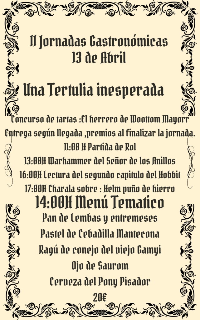 Amanecía un sábado 13 de abril soleado en Madrid, como prácticamente todos en las últimas semanas. Desayuno tardío y un viaje de apenas hora y media a Talavera de la Reina para llegar al Smial de Edoras. Era la celebración de sus II Jornadas Gastronómicas, que esta vez llevaban el nombre de Una tertulia inesperada.