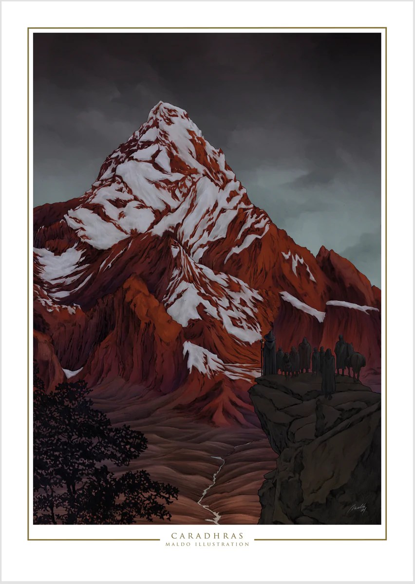 »Sólo las vi una vez de lejos en la vigilia, pero las conozco y sé cómo se llaman, pues debajo de ellas está Khazad-dûm, la Mina del Enano, que ahora: llaman el Pozo Oscuro, Moria en la lengua élfica. Más allá se encuentra Barazinbar, el Cuerno Rojo, el cruel Caradhras; y aún más allá el Cuerno de Plata y el Monte Nuboso: Celebdil el Blanco y Fanuidhol el Gris, que nosotros llamamos Zirak-zigil y Bundushathûr.